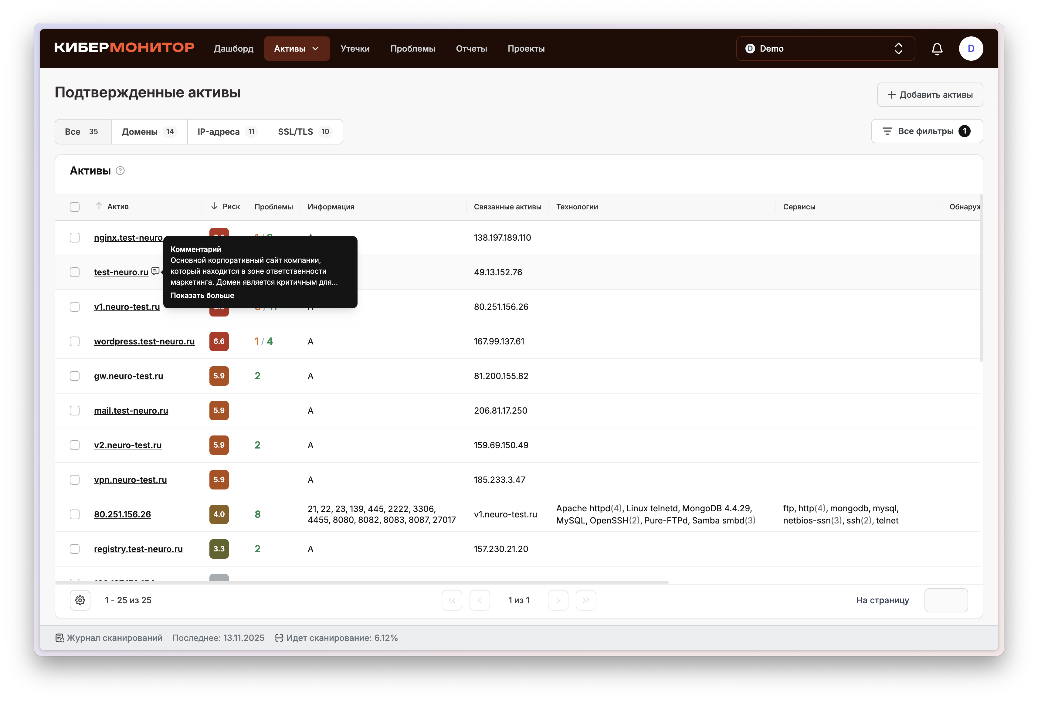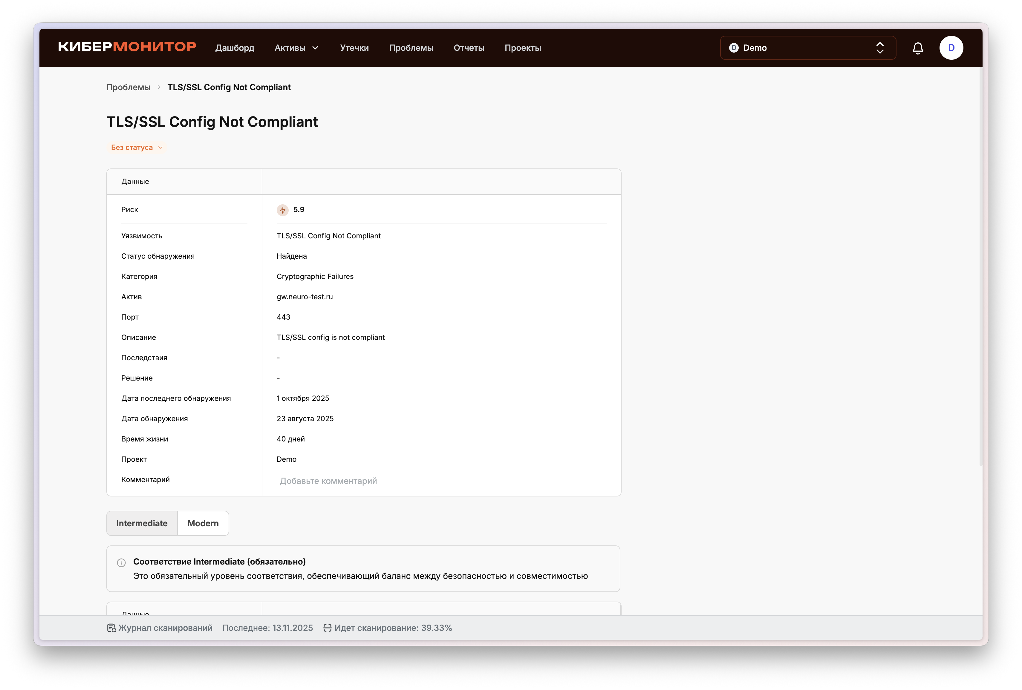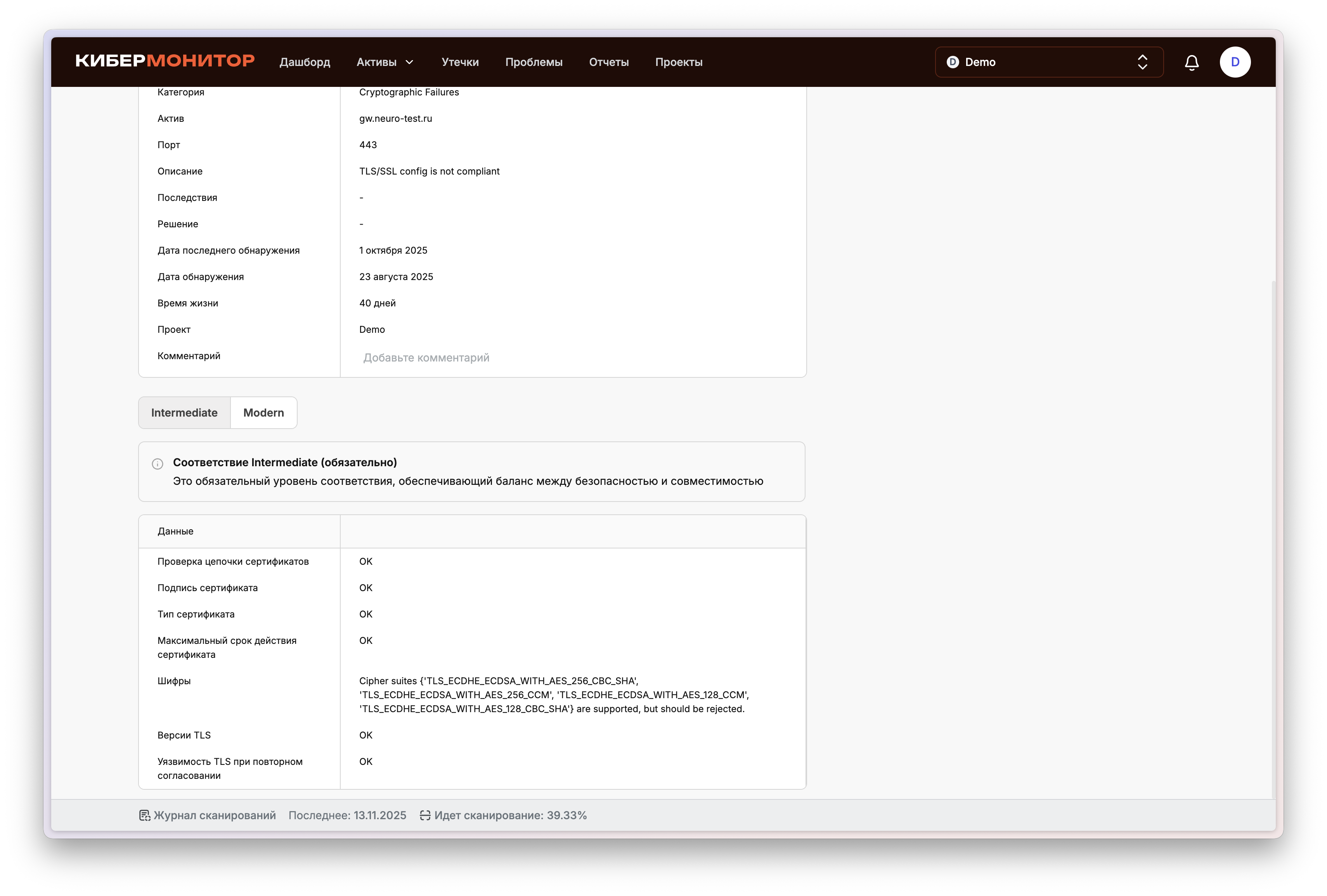 Мы продолжаем делать «КиберМонитор» удобнее и понятнее — как для специалистов, так и для руководителей. Свежие улучшения помогут вам лучше видеть, что происходит во время сканирования, и работать с результатами в едином пространстве без лишней переписки. Уведомления о старте сканирования Теперь вы будете получать уведомление, когда начинается проверка вашей инфраструктуры. Это позволит держать руку на пульсе: понимать, что процесс запущен и когда ждать обновлений. При желании уведомления можно отключить — и в Личном кабинете. Настройки уведомлений в Личном кабинете В Личном кабинете появились настройки уведомлений — теперь можно самостоятельно выбрать, какие оповещения получать, а что — отключить. Это дает больше контроля и гибкости: вы управляете потоком уведомлений в соответствии с внутренними процессами компании. Статус и прогресс сканирования в реальном времени Мы добавили отображение процента выполнения текущего сканирования в Личном кабинете. Это помогает планировать работу и оценивать, когда будут готовы результаты. Дата следующего сканирования В Личном кабинете теперь отображается дата следующей проверки. Так проще организовать внутренние процессы, например, согласовать периоды обновлений, отчетности или изменений в инфраструктуре. Новый статус: «Обработка результатов» После завершения активной фазы сканирования проект получает статус «Обработка результатов». Это делает процесс более прозрачным: вы видите, что данные уже собраны и анализируются. Комментарии к проблемам и активам Теперь к каждой проблеме и активу можно добавлять комментарии. Это позволяет сохранять контекст работы с уязвимостями и активами — фиксировать уточнения, статусы, причины решений или промежуточные результаты. Вся информация остается в системе и всегда доступна при повторных проверках и анализе. Детализированные данные в проблемах SSL/TLS В карточках проблем SSL/TLS теперь отображается новый блок с техническими деталями: поддерживаемые шифры, версии TLS, тип и срок действия сертификата, а также цепочка доверия. Это делает результаты проверки более прозрачными, помогает быстрее понять причину несоответствия и оценить уровень защищенности. Для удобства предусмотрено переключение между уровнями соответствия (Intermediate и Modern), чтобы сравнить текущие настройки с рекомендованными стандартами безопасности. Каждое обновление мы делаем с одной целью — чтобы вам было проще управлять безопасностью бизнеса. Если у вас есть идеи, как улучшить сервис — делитесь, мы читаем все и внедряем лучшее! Подробнее обо всех обновлениях читайте здесь Автоматическая киберзащита для вашего бизнеса Регулярный контроль чувствительных данных компании, понятные отчёты и экспертная поддержка с точными рекомендациями. запросить демо Обновления и новости Поделиться