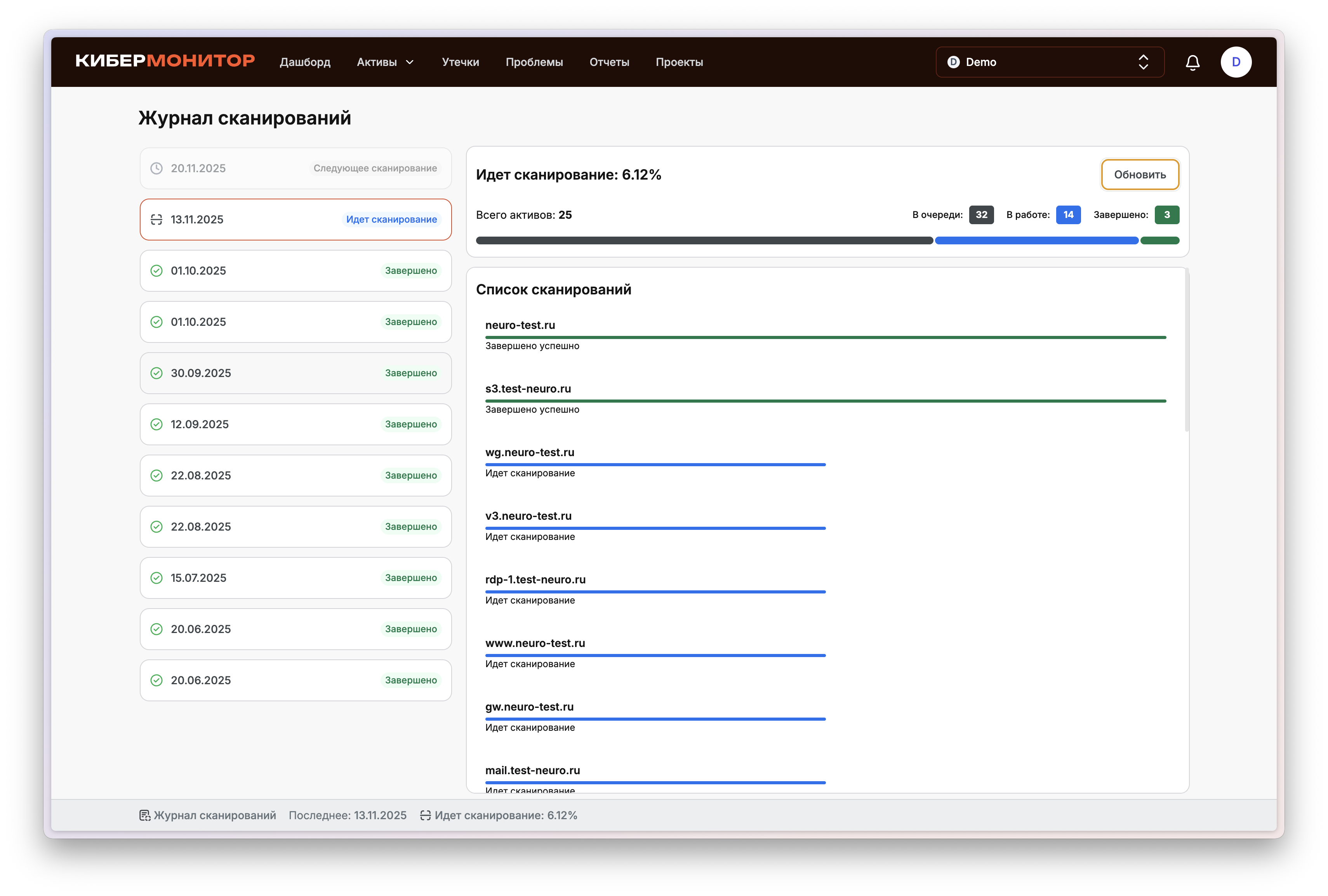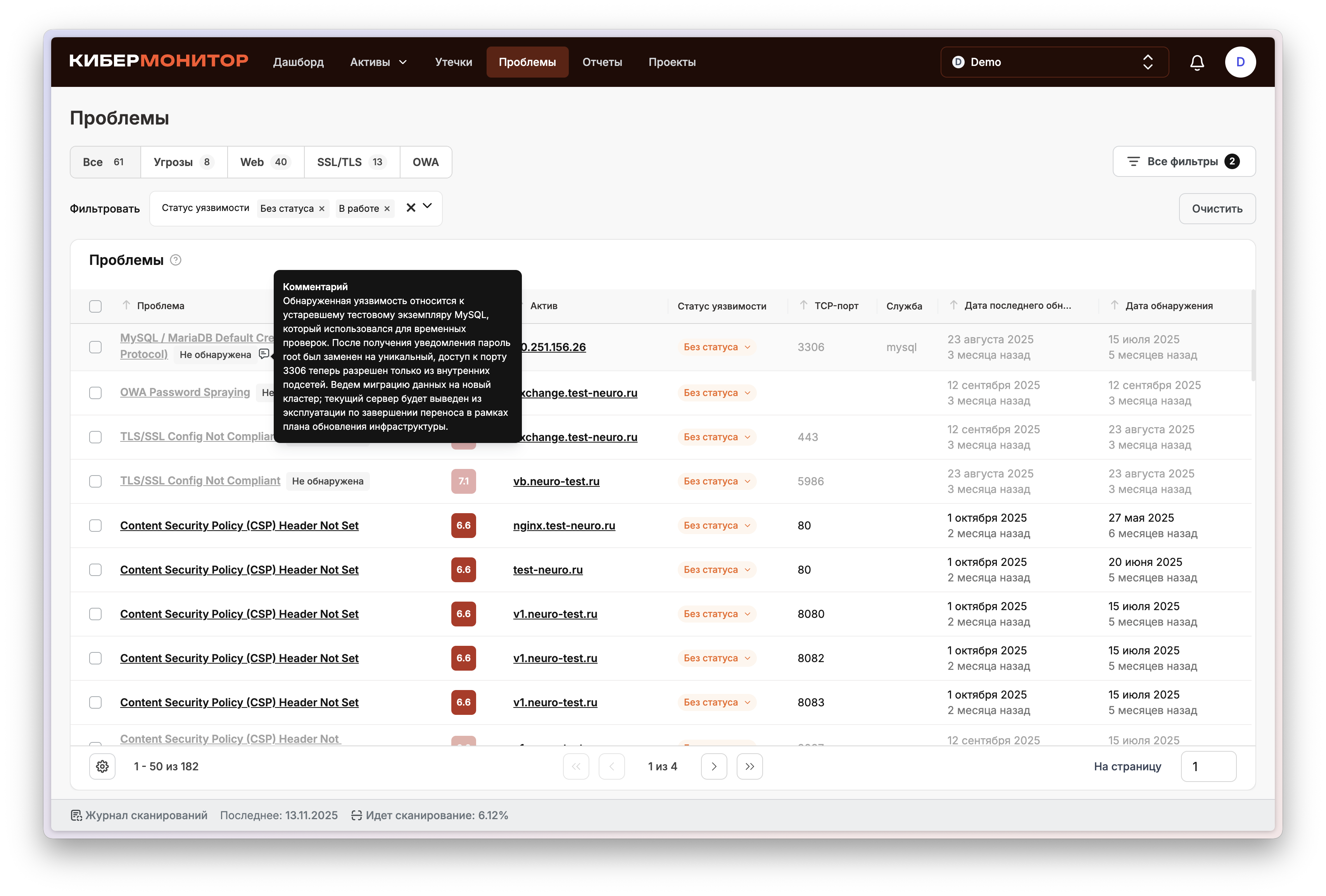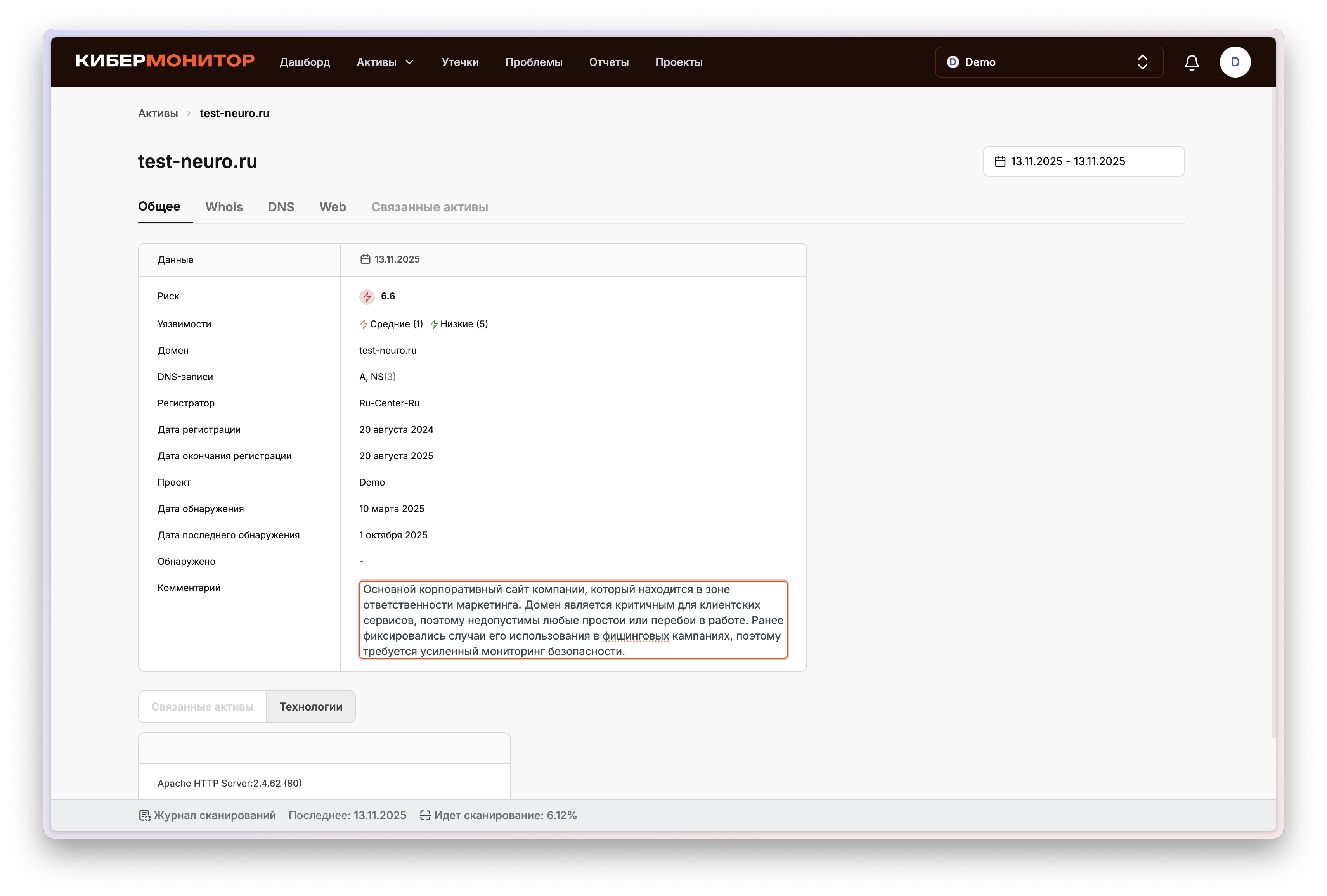 Мы продолжаем делать «КиберМонитор» удобнее и понятнее — как для специалистов, так и для руководителей. Свежие улучшения помогут вам лучше видеть, что происходит во время сканирования, и работать с результатами в едином пространстве без лишней переписки. Уведомления о старте сканирования Теперь вы будете получать уведомление, когда начинается проверка вашей инфраструктуры. Это позволит держать руку на пульсе: понимать, что процесс запущен и когда ждать обновлений. При желании уведомления можно отключить — и в Личном кабинете. Настройки уведомлений в Личном кабинете В Личном кабинете появились настройки уведомлений — теперь можно самостоятельно выбрать, какие оповещения получать, а что — отключить. Это дает больше контроля и гибкости: вы управляете потоком уведомлений в соответствии с внутренними процессами компании. Статус и прогресс сканирования в реальном времени Мы добавили отображение процента выполнения текущего сканирования в Личном кабинете. Это помогает планировать работу и оценивать, когда будут готовы результаты. Дата следующего сканирования В Личном кабинете теперь отображается дата следующей проверки. Так проще организовать внутренние процессы, например, согласовать периоды обновлений, отчетности или изменений в инфраструктуре. Новый статус: «Обработка результатов» После завершения активной фазы сканирования проект получает статус «Обработка результатов». Это делает процесс более прозрачным: вы видите, что данные уже собраны и анализируются. Комментарии к проблемам и активам Теперь к каждой проблеме и активу можно добавлять комментарии. Это позволяет сохранять контекст работы с уязвимостями и активами — фиксировать уточнения, статусы, причины решений или промежуточные результаты. Вся информация остается в системе и всегда доступна при повторных проверках и анализе. Детализированные данные в проблемах SSL/TLS В карточках проблем SSL/TLS теперь отображается новый блок с техническими деталями: поддерживаемые шифры, версии TLS, тип и срок действия сертификата, а также цепочка доверия. Это делает результаты проверки более прозрачными, помогает быстрее понять причину несоответствия и оценить уровень защищенности. Для удобства предусмотрено переключение между уровнями соответствия (Intermediate и Modern), чтобы сравнить текущие настройки с рекомендованными стандартами безопасности. Каждое обновление мы делаем с одной целью — чтобы вам было проще управлять безопасностью бизнеса. Если у вас есть идеи, как улучшить сервис — делитесь, мы читаем все и внедряем лучшее! Подробнее обо всех обновлениях читайте здесь Автоматическая киберзащита для вашего бизнеса Регулярный контроль чувствительных данных компании, понятные отчёты и экспертная поддержка с точными рекомендациями. запросить демо Обновления и новости Поделиться